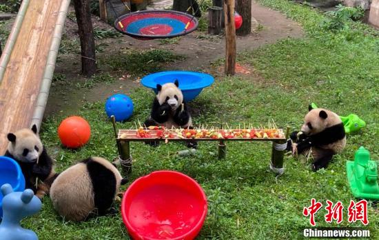 6月1日,重庆动物园的大熊猫享用“自助烧烤”过“六一”国际儿童节。当日,重庆动物园的工作人员们将玉米、圣女果、西瓜、南瓜、香蕉、菠萝、苹果、黄瓜、胡萝卜、笋子等12种蔬菜和水果制作成串串,送给大熊猫作为节日礼物。