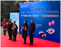 颁奖仪式上,重庆市动物园管理处处长杨立业为庆典致辞,对大家的到来表示热烈欢迎,并感谢各位热心的朋友,感谢他们通过绘画的形式为两对大熊猫双胞胎宝宝送上祝福,祝愿大熊猫宝宝健康成长!同时,为鼓励社会各界人士参与支持大熊猫保护及种群发展,我园将开展“双双”、“重重”、“喜喜”、“庆庆”认养项目保护活动。