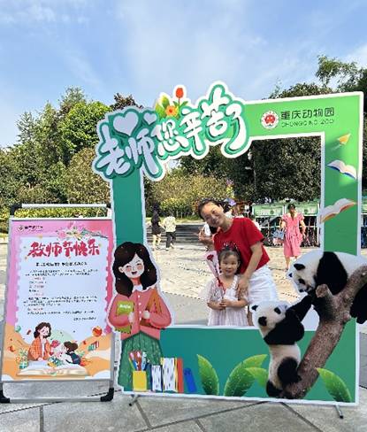 金秋,是收获的季节,更是感恩的季节,在这个硕果飘香的丰收时节,第39个教师节踏着轻盈的脚步向我们走来,为弘扬中华民族尊师重教的传统美德,重庆动物园于2023年9月10日推出教师节免票活动,活动当天教师本人持教师资格证在线上平台购买“教师0元票”可免费入园,门口的工作人员还向教师们每人献上一支康乃馨,当天线上共售出“教师0元票”1400余张,送出鲜花500余支。东二门入口处还设有可爱的打卡合影框供教师们拍照留念,现场有情侣间甜蜜的依偎、更有亲子间温馨的互动,一张张灿烂的笑脸被定格在美好的瞬间,节日的空气里弥漫着感恩的温情,幸福的味道。