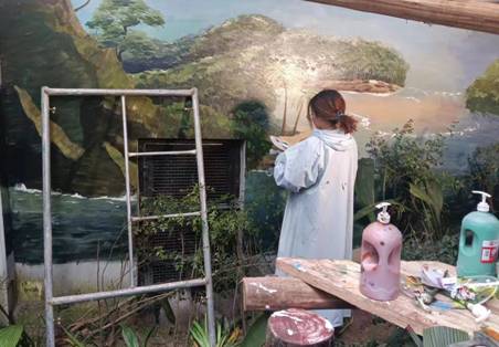 此次环境丰容是对黑帽悬猴、北豚尾猴共6只动物使用的两间兽舍进行改造。动物管理科根据动物生活习性和原栖息地环境,就丰容设计、安全性等方面开展了多次讨论并形成可行性方案,由基建总务科配合完成相关工作的实施落地。在草坪地面改造和搭建栖架完成之后,动物科丰容小组齐心协力,合理安排本职工作的同时,积极推进墙体彩绘工作。经过近一个月的封闭改造,两间兽舍的丰容工作全部完成,并保证动物在春节假期的顺利展出。