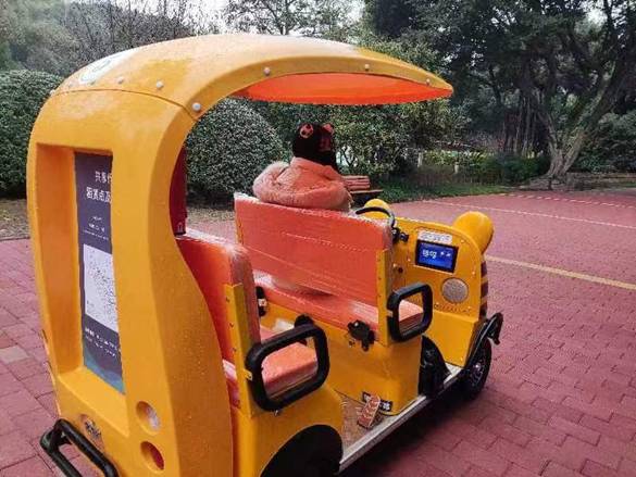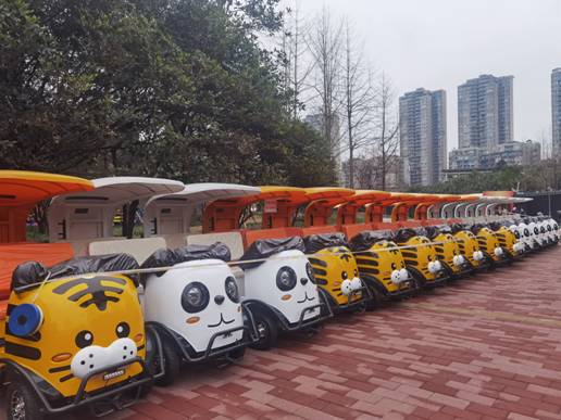景区东一门儿童乐园旁和中门入口处设有两处专用停车点,游客可在任一停车点租车还车,方便快捷。共享电动代步车与文旅资源结合,融入了动物卡通元素,车头是黑白相间的大熊猫和橙黄色的小老虎,为景区增添了一道亮丽的风景,同时也为游客带来更加丰富的旅游体验。