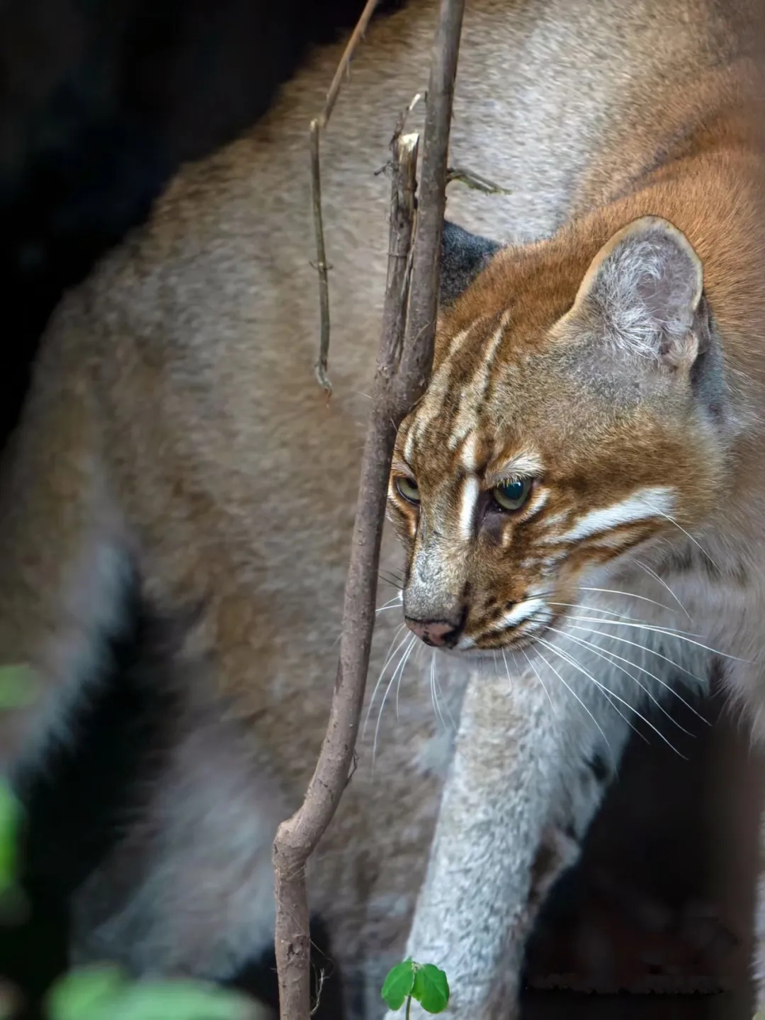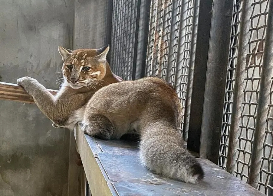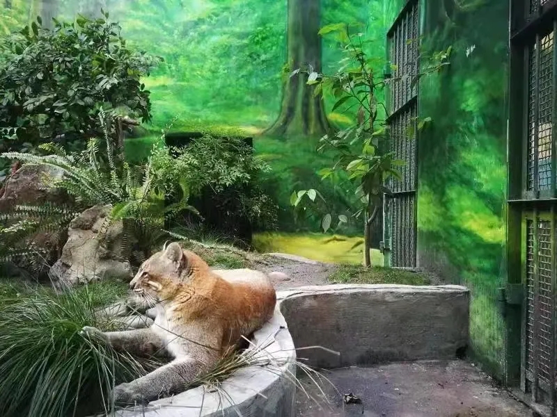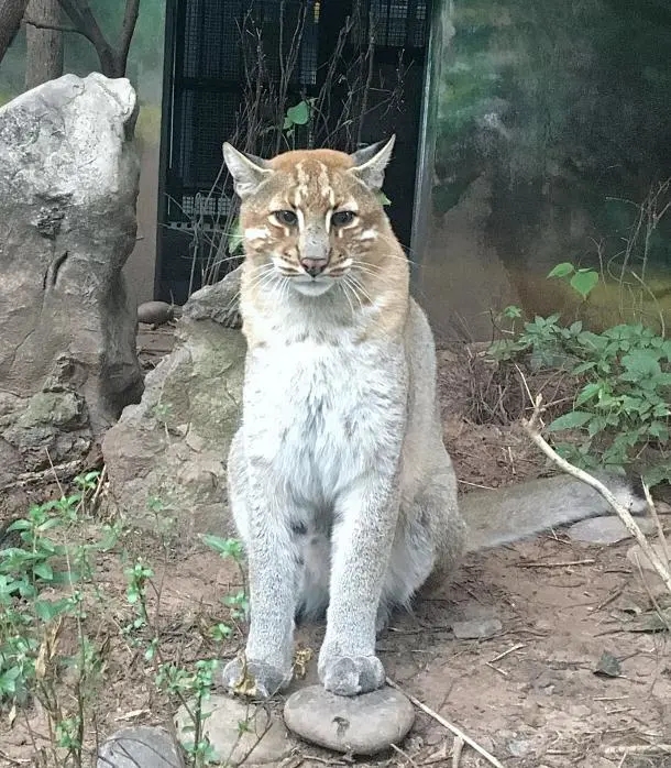 阿宅,是重庆动物园的金猫,猫如其名,社恐气质,总是喜欢宅在内舍巢箱里,白天睡大觉,夜里自个开派对。初见阿宅,是在2015年11月1日,第一眼见到时,我震惊于这家伙块头这么大,尤其是当它凝视时流露出的霸气眼神,搭配着它壮硕的身材,粉碎了我“金猫只是猫”的自信想法。挫败之后,反而激起兴趣,我上网搜索学习所有关于金猫的知识。了解到作为猫科动物的阿宅,其实体型和中型犬差不多,性情凶猛,素有“黄虎”之称,亦属于山地森林生态系统中顶级的食肉兽类动物。