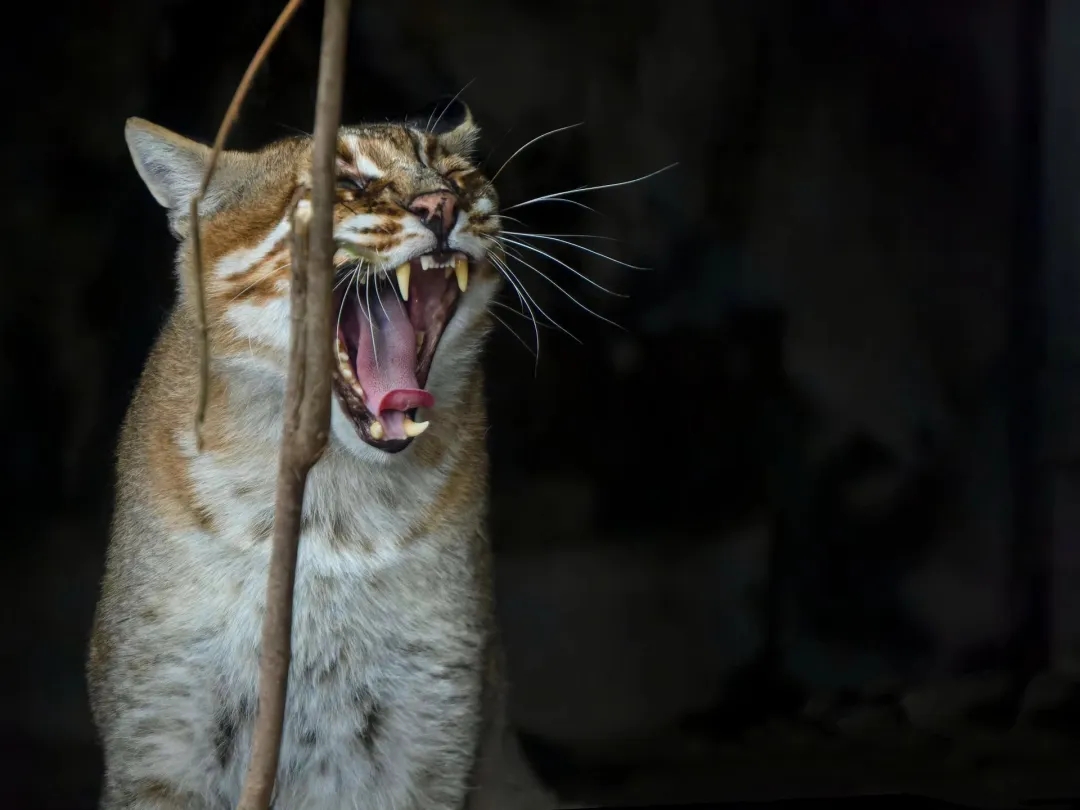 从此,我便开始了快乐又辛酸的铲屎生活。每个工作日的清晨,我都会在阿宅的外展面玻璃处观察它的状态。阿宅总是侧躺于巢箱,唤之不理,最多不耐烦地动动耳朵,仿佛在说“行了,知道了”。每天早上九点过,我便准备好阿宅爱吃的牛肉、猪肉和鸡骨架等食物,放在内室,想趁机和它熟络熟络。可即便面临美食诱惑,阿宅也保持高度警惕性,只会躲在内室入口处,猫猫祟祟地打望着我。直到我走到远处,确认不会对它造成威胁后,它才会迅速跑到内室叼一块肉再疾驰而去,躲在巢箱里大快朵颐。好几次它进来觅食时,发现我还未走远,就立即反身跑出去躲着。这就是金猫的天性——非常敏感,小心翼翼。