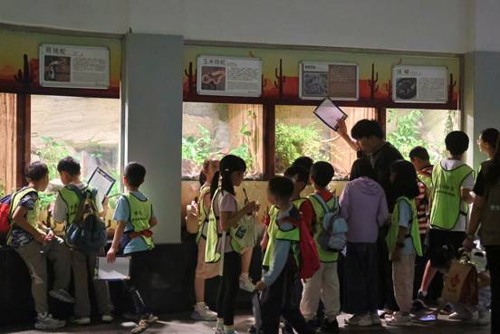 夜幕降临,25名小朋友在科普老师的带领下,开启了一场独特的动物探秘之旅:他们首先来到两栖爬行馆,由科普老师生动地讲解了鳄鱼、蜥蜴、蛇等两栖爬行动物的夜间生活习性;随后,来到综合兽馆,近距离观察了豹猫等夜行性动物,了解它们适应夜间生活的独特生理结构和行为特点。