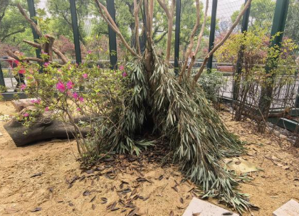 丰容工作秉持生态环保、因地制宜原则,充分利用熊猫馆使用后的废弃竹枝,搭配成品草窝、稻草、枯枝及橡皮桶等材料,依据不同雉类特性,定制搭建大小适配的生态巢穴。在外区沙地(非防雨区域),采用半埋式橡皮桶内置枯树叶,外层以竹枝、竹叶严密遮掩,打造兼具避雨与隐蔽性的巢穴;在内区(防风雨区域),以成品草窝为基底,用竹枝竹叶遮挡隐蔽,窝内铺设稻草、放置假蛋,模拟温暖安全的繁育环境;针对体型较大的绿孔雀,依托圈舍内树木支撑,用竹枝搭建2个带隐蔽通道的大型专属巢穴。